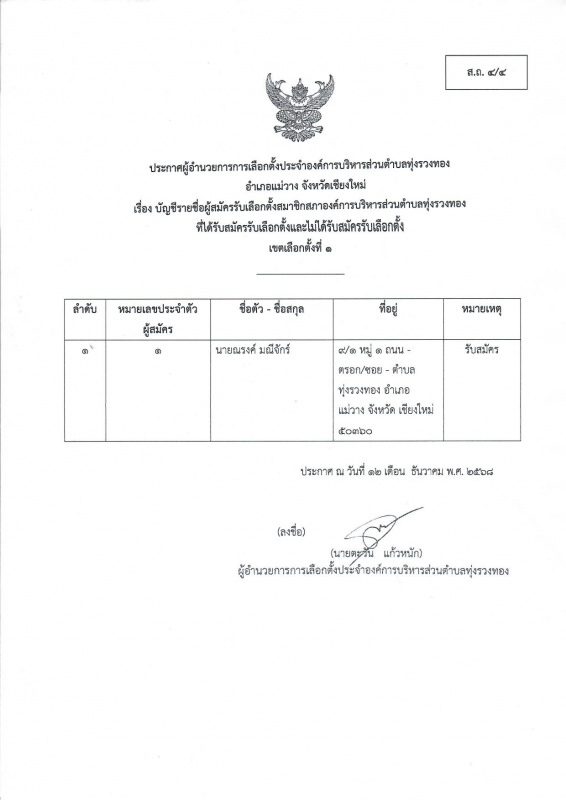 ประกาศรายชื่อผู้มีสิทธิสมัครรับเลือกตั้งสมาชิกสภาองค์การบริหารส่วนตำบลทุ่งรวงทอง เขตเลือกตั้งที่ 1 (ส.ถ.4/4)