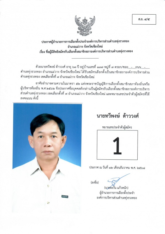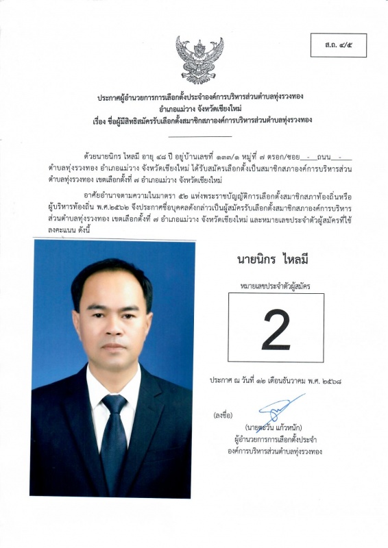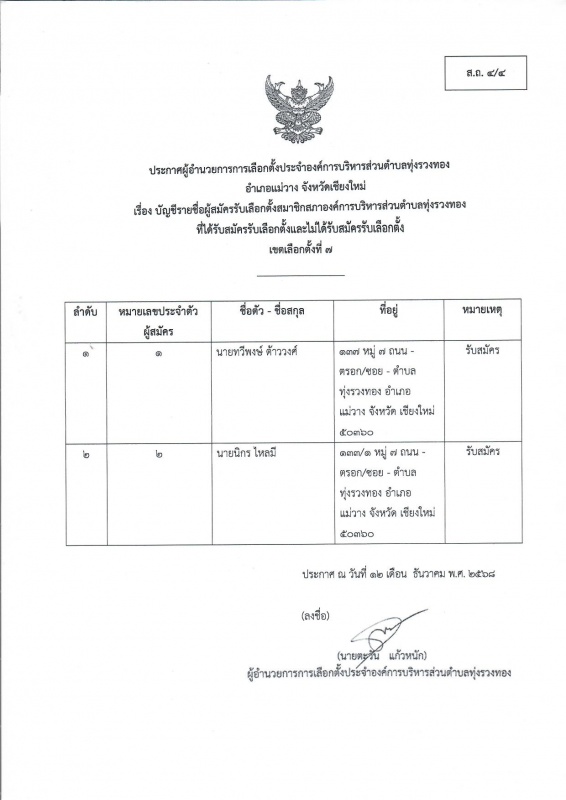 ประกาศรายชื่อผู้มีสิทธิสมัครรับเลือกตั้งสมาชิกสภาองค์การบริหารส่วนตำบลทุ่งรวงทอง เขตเลือกตั้งที่ 7 (ส.ถ.4/4)