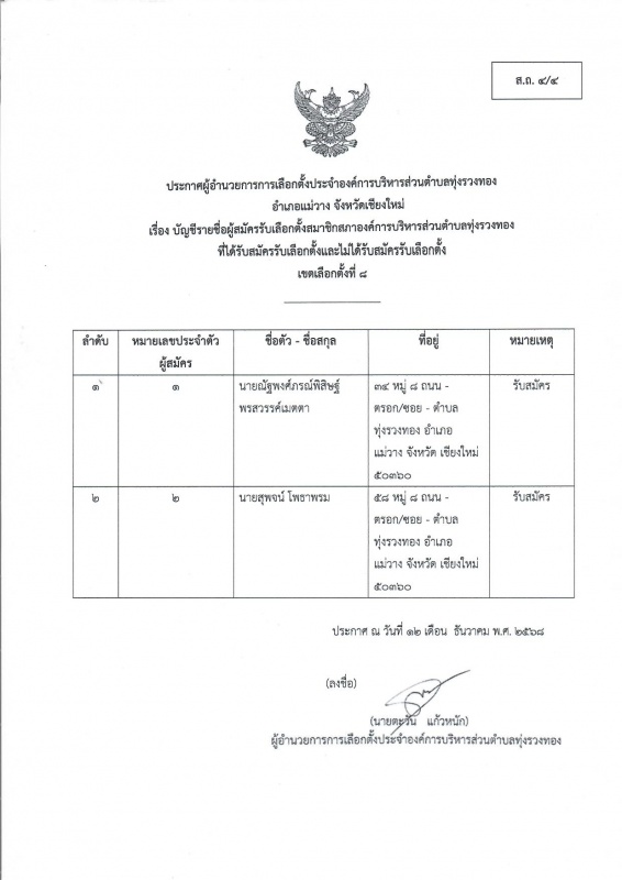 ประกาศรายชื่อผู้มีสิทธิสมัครรับเลือกตั้งสมาชิกสภาองค์การบริหารส่วนตำบลทุ่งรวงทอง เขตเลือกตั้งที่ 8 (ส.ถ.4/4)