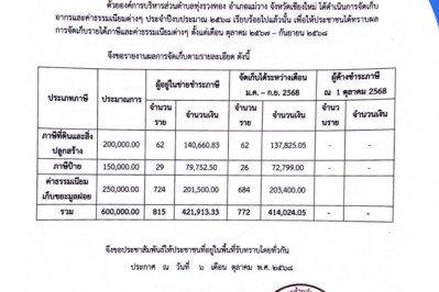 ประกาศ : เรื่อง รายงานสรุปผลการจัดเก็บภาษีและค่าธรรมเนียมต่างๆ ประจำปีงบประมาณ พ.ศ.2568