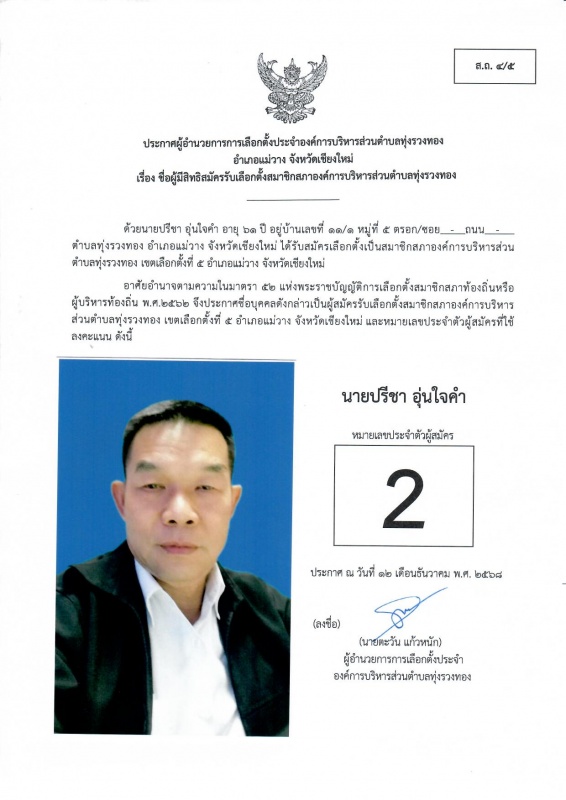 ประกาศรายชื่อผู้มีสิทธิสมัครรับเลือกตั้งสมาชิกสภาองค์การบริหารส่วนตำบลทุ่งรวงทอง เขตเลือกตั้งที่ 5 (ส.ถ.4/4)