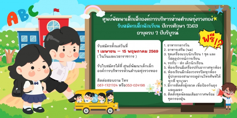 รับสมัครตั้งแต่วันที่ 1 เมษายน - 15 พฤษภาคม 2569 (ในวันเวลาราชการ) สามารถรับสมัครได้ที่ ศูนย์พัฒนาเด็กเล็กองค์การบริหารส่วนตำบลทุ่งรวงทอง